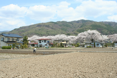 ブドウ棚の向こうの山沿いのサクラもさきはじめています。