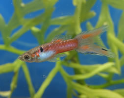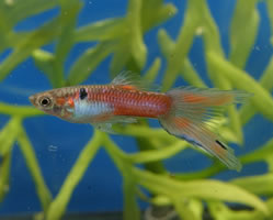 (2006年6月の表現です) 現在色彩の表現は大体3パターンです、背びれの色合いが主な違いですが、どのタイプもルブラ表現はきれいです。 まだ下地に何かいるのか楽しみなところです。 今のところルブラとしての出現はなから50%ぐらいです、ここにきて得られる仔にRREAとブラオが絡んできておりブラオ・バイス部分はルブラが表現できませんので少々出現の割合がわかりづらくなっていますがルブラの表現は安定しています。 色々な品種と確認のための交配を重ねていますので、ルブラの遺伝的な流れがはっきりしてくるにはもう少し時間がかかると思います、しかしRREAのルブラは良いですネ。 |