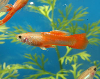 赤いグッピーというはなしのなかで、ピングーはほんの少しですが赤を持っているというのは聞かせていただいていたのでこの赤を多くしてみたらどうなりのだろうか? という単純な発想からはじまった個体です。 親にゴールデンレッドテールタキシードを使いピングー交配させてみました。 F1個体では当然のこと普通体色のレッドテールタキシード風の表現になりました、そうしましてここでF2個体の表現が出はじめて来たのですが・・・・・・・・・。 まずF2ではピングーが期待できると考え早いうちに普通体色の個体は淘汰してゴールデンぽい個体を残しました。 残した個体の表現を見ますと、まずたぶんピングー・そしてゴールデンピングー・でご紹介しているこの赤い個体です。 想像の範囲としては、ゴールデンレッドテールタキシード・ピングーレッドテール?orゴールデンピングーレッドテール?・・・・。 皆さまどうおもわれますか。 まずは確認作業でしょうか・・・・・・・・・・本当に輪切りにしないと解らない・・・・・・のかな? また後日ご報告を。