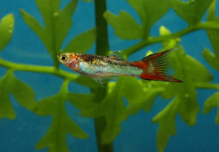 以前に「ターコイズグリーン」で、ご紹介した個体を繁殖させている中からの出現です。 このタイガーホリゾンブルーはレースをかんでいると思われます。 この赤は、この辺のからみかもしれませんね、それにしましても強い色合いのきれいな個体ですね、うまく揃うとよろしいのですが。 |