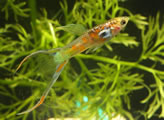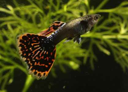 代が進むにつれて表現が安定してくると思います、タイガー系でルブラ表現、全体としてはホリゾンブルーがベースです。グッピーらしからぬ表現とても快活なところは魅力的です。タイガー系ですが自然繁殖が可能です。 |